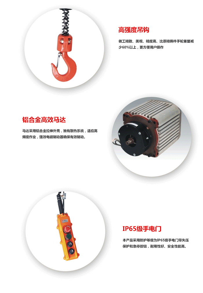 5、極限開關:吊上吊下都有極限快關裝置,使電機自動停止,反防止鏈條超出,確保安全。