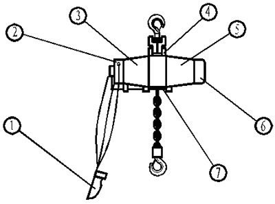 氣動葫蘆主要由: ①手控閥(手柄式和手拉繩式) ②主控閥 ③氣馬達 ④吊掛 ⑤減速器 ⑥剎車機構(gòu) ⑦連鎖機構(gòu)等部分組成,見結(jié)構(gòu)示意圖。這七部分有序的巧妙構(gòu)成,保證了產(chǎn)品安全有效的運行。