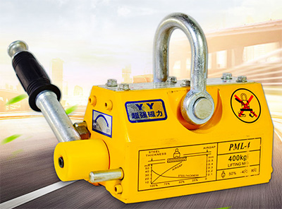 永磁起重器由高性能釹鐵硼永久磁性材料組成強磁系統,通過手柄的轉動,改變強磁系統磁力達到對工件的吸持和釋放。起重器上部有供提起物件的吊環,下有一V形槽供吸持相應的圓柱形物體所用。 永磁起重器采用的高性能永磁材料是:稀土永磁一釹鐵硼為磁源,具有不耗電、吸力強、剩磁低、操作輕便、壽命長、安全可靠等特點,產品結構先進,按照出口標準組織生產,品質性能達到國際同類產品先進水平。廣泛用于機械工業、模具制造業、倉庫和交通運輸等部門搬運鋼板、鋼錠等導磁性物體。