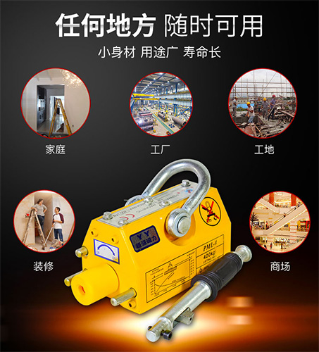 安全系數高,最大拉脫力是額定起重力的 2.8-4 倍。手動型永磁起重器手柄開關附有安全鈕,可單手操作,方便安全。起重底面“ V ”型槽設計。全自動永磁起重器無需人力扳動手柄,靠電動吊車下鉤的升降控制吸附,可起吊相對應的圓鋼、鋼板,不用電,使用安全,廣泛用于鋼材的起重搬運,平整的機械零部件及各種模具的安裝和搬運。