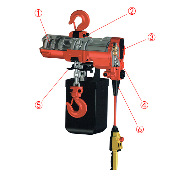 ①  高耐用性齒輪箱,符合M4級別耐用要求;②  上吊鉤易拆裝;③  獨特排氣接口設計、可連接管路將排氣引出;④  高可靠性換向閥組,可防止漏氣;⑤  低高度,最大限度滿足狹小空間使用;⑥  氣管保護套;