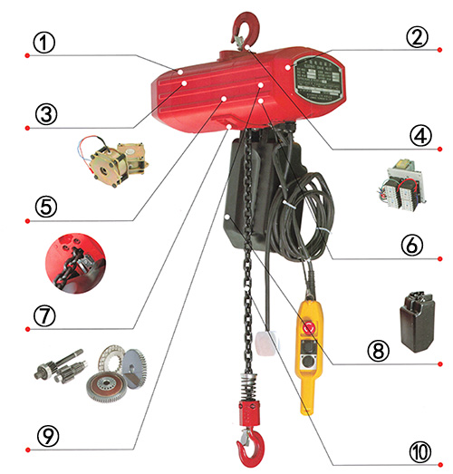1、在額定電壓頻率和額定起重下測量。噪聲值≤82 (用噪音計以一米距離測試。)