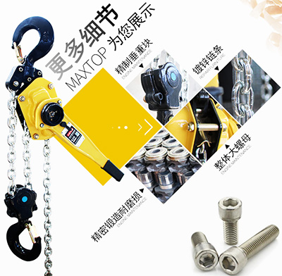 構造優秀,應用可以信賴,堅固耐用。整個設備高效率,使用方便、舒服。重量輕,重量輕,攜帶方便。所有為結構鋼。特等的鋁合金傳動鏈條。所有為傳動齒輪旋轉。傳動齒輪和軸的旋轉處常有滾動軸承或軸套。商品表層歷經靜電噴塑解決。技術專業的鋁合金鉤可以滿足商品的超重。商品能考慮額定值荷載的150%的凈重。