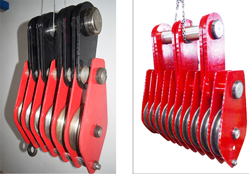 滑車應依據受力分析及驅動力和容繩量來挑選其噸數和輪數,不可超重應用。滑車務必有及格證實,應用前要開展查驗并滴油潤化,其旋轉一部分務必靈便。滑車的滑輪槽表層應光潔,不可有裂痕、傷疤等缺點。禁止用電焊焊接加固的方式 修復吊鉤、吊環和吊梁。多輪滑車僅應用在其中一部分滑輪時,滑車的起重吊裝工作能力應相對的減少,減少的標值按滑輪總數占比明確。應用時要對稱性挨近應用,以防輪重。滑車組兩滑車中間最少間距,一般不低于輪徑的5倍。2組(或2組左右)滑車組,肩負一個相互作用力時,需設制動器原理,以超過支承平衡。滑車的吊鉤,若有掛鉤將會時,應采取有效密封。導向性滑車務必按跑繩抗拉力和導向性角來挑選,不可隨意拴掛超重應用。